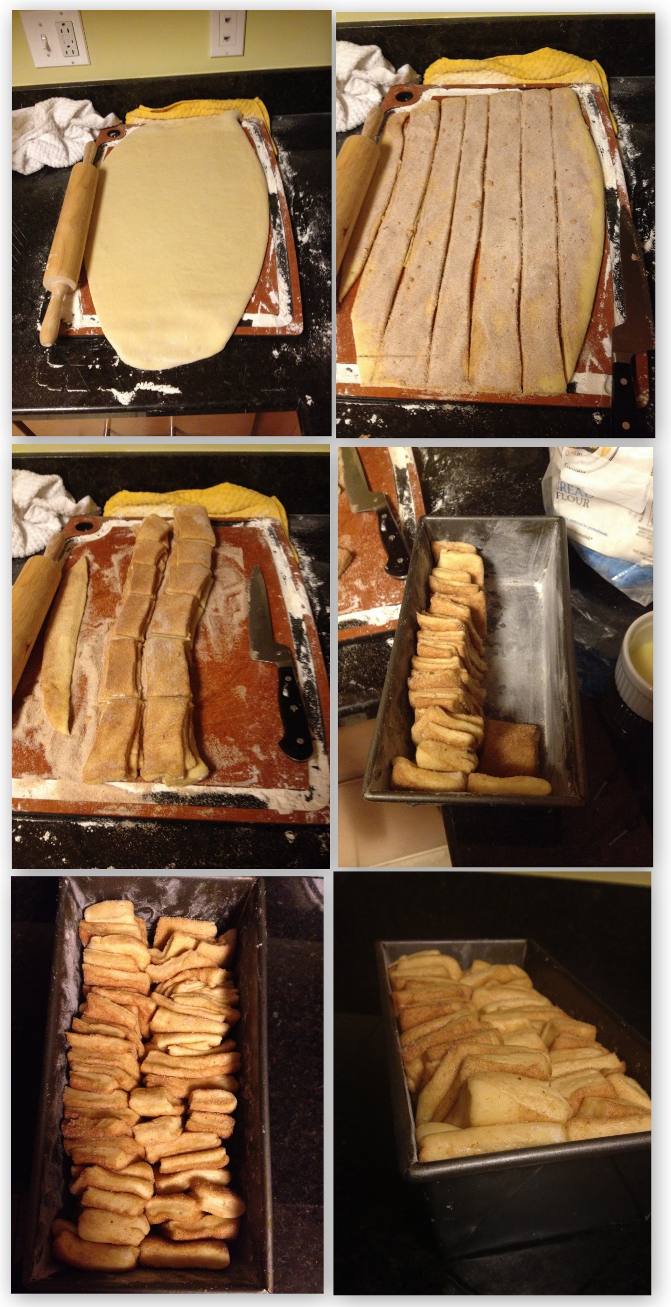 With that, I set about making the pull-apart bread. I ended up using a bit more flour than the recipe that served as the inspiration for this project. I needed the extra flour to get the right consistency before kneading. The extra dough also proved a special treat, since I had a few extra dough squares that I put into buttered ramekins. The dough that went into the ramekins produced a beautiful, flower-like shape.